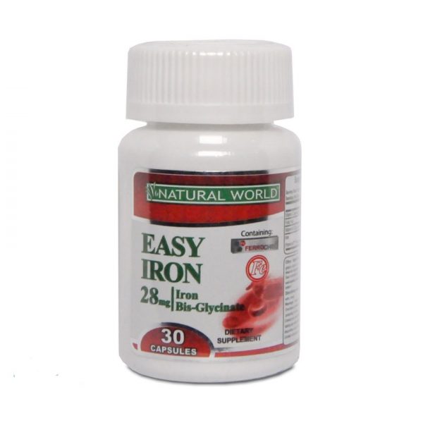 کپسول ایزی آیرون نچرال ورلد 30 عددی دارای آهن، فولیک اسید (B۹)، ویتامین B۱۲ و ویتامین C است. ایزی آیرون میزان آهن مورد نیاز بدن را تامین کرده و به درمان کم خونی ناشی از فقر آهن کمک می کند. این محصول را میتوانید خیالی آسوده و مطمئن از داروخانه آنلاین اهواز فارما تهیه کنید.